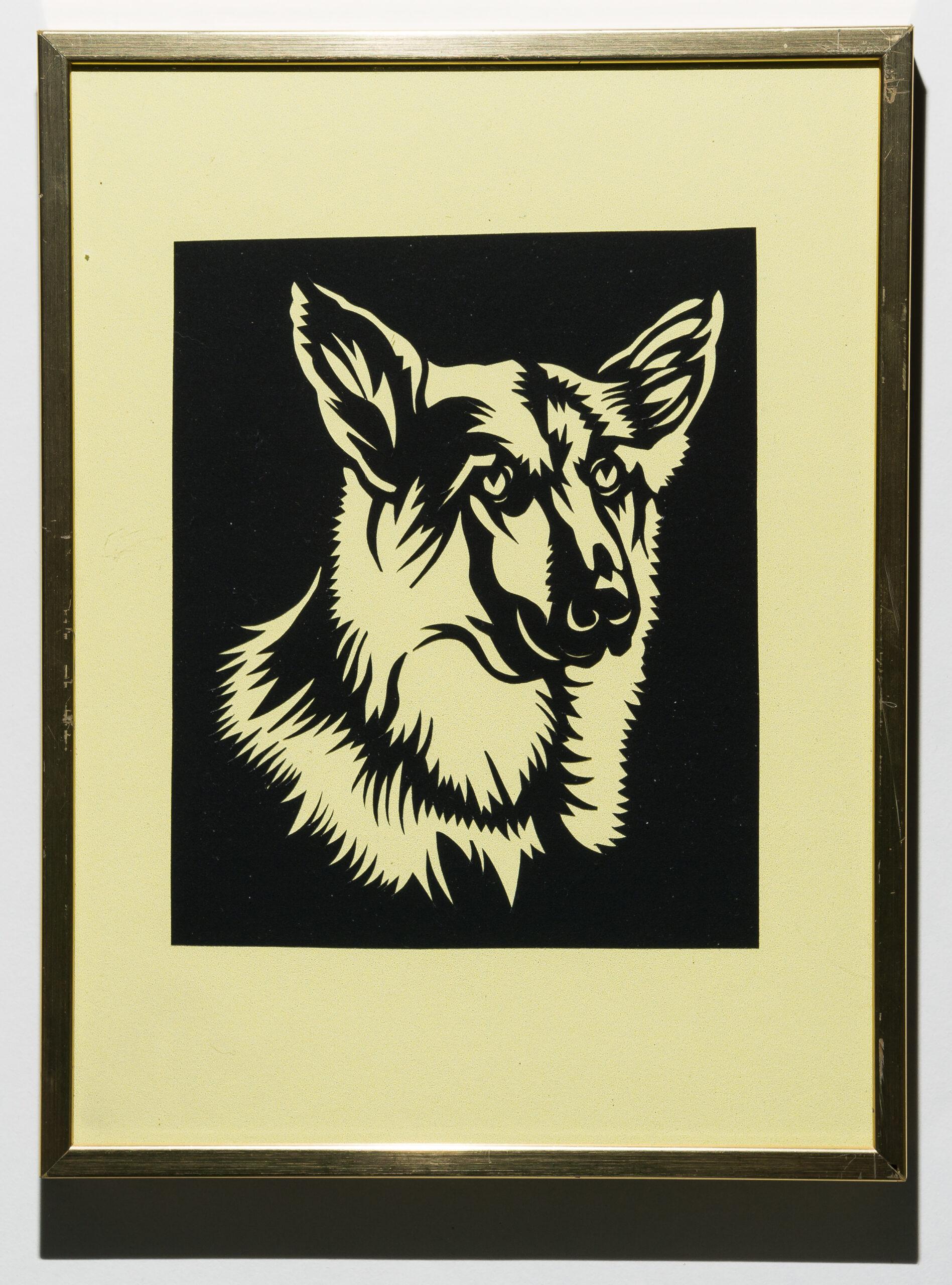 Uit zwart papier geknipte kop van een herdershond toegeschreven aan Nanne Geert Terpstra, bevestigd op crèmekleurig papier. Niet gesigneerd.