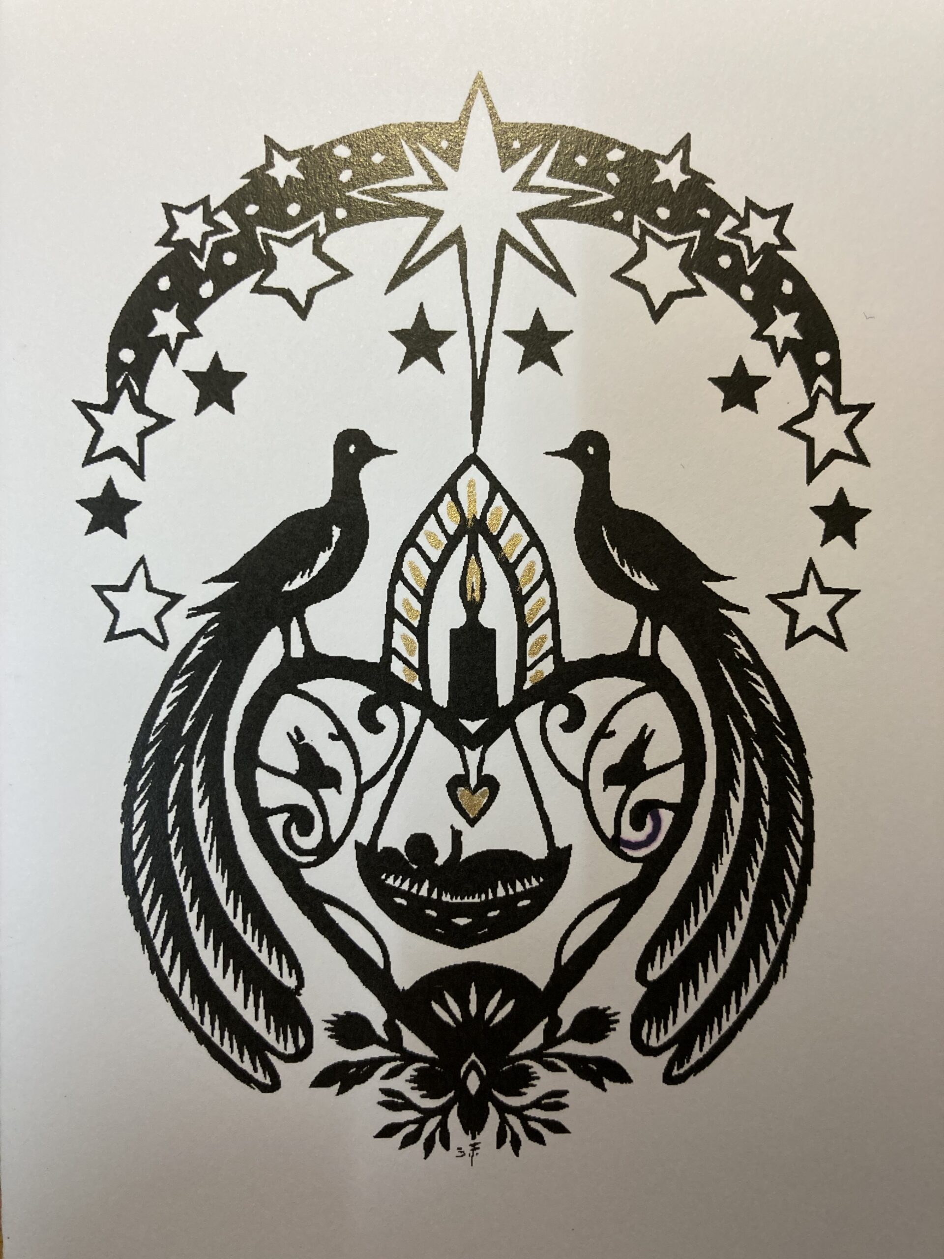 Een gedrukte dubbele kerstkaart met het kerstkind in de kribbe geflankeerd door twee vogels naar een knipsel geknipt door Susan Faber.