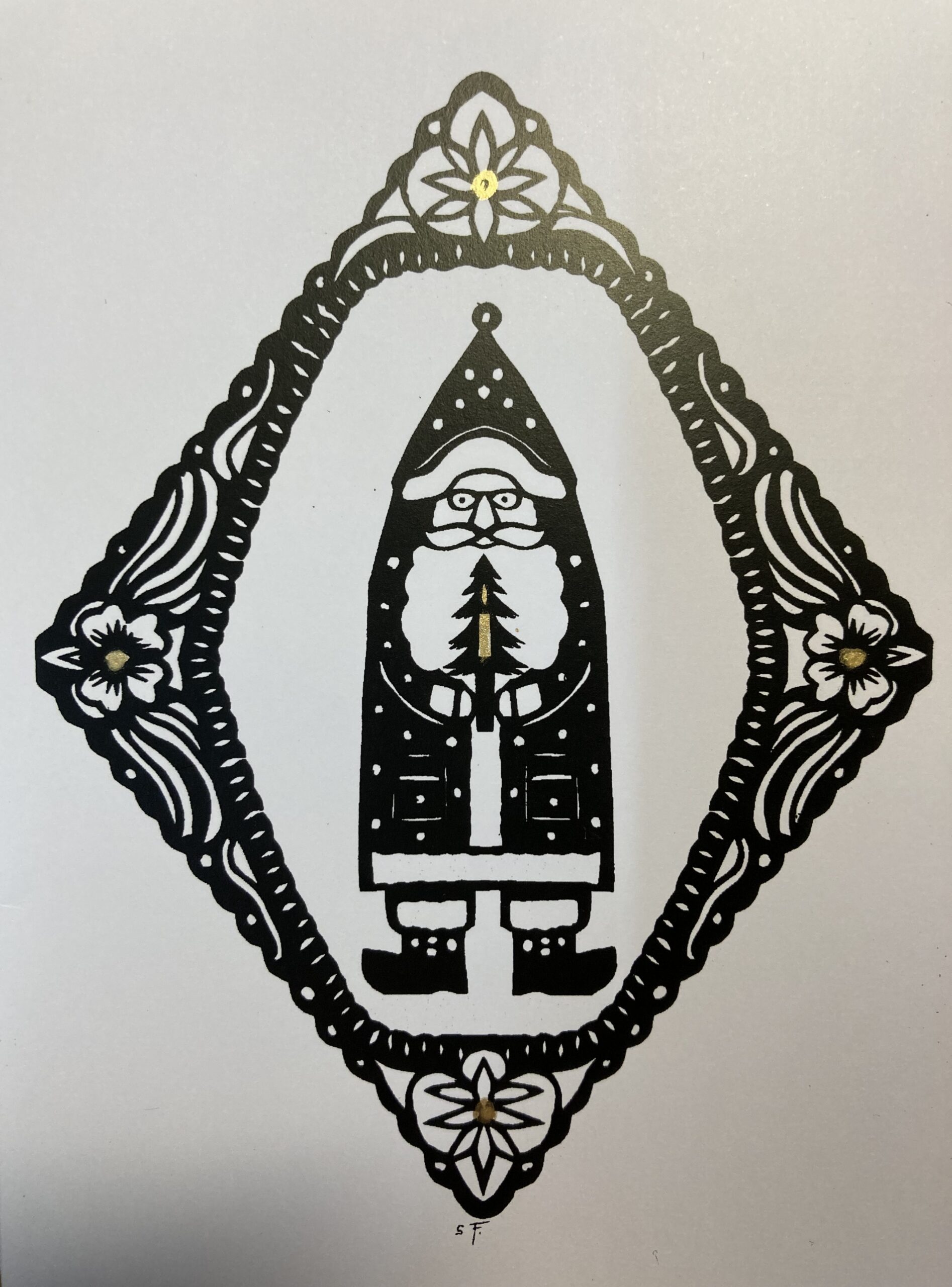 Een gedrukte dubbele kerstkaart met een kerstman naar een knipsel geknipt door Susan Faber.