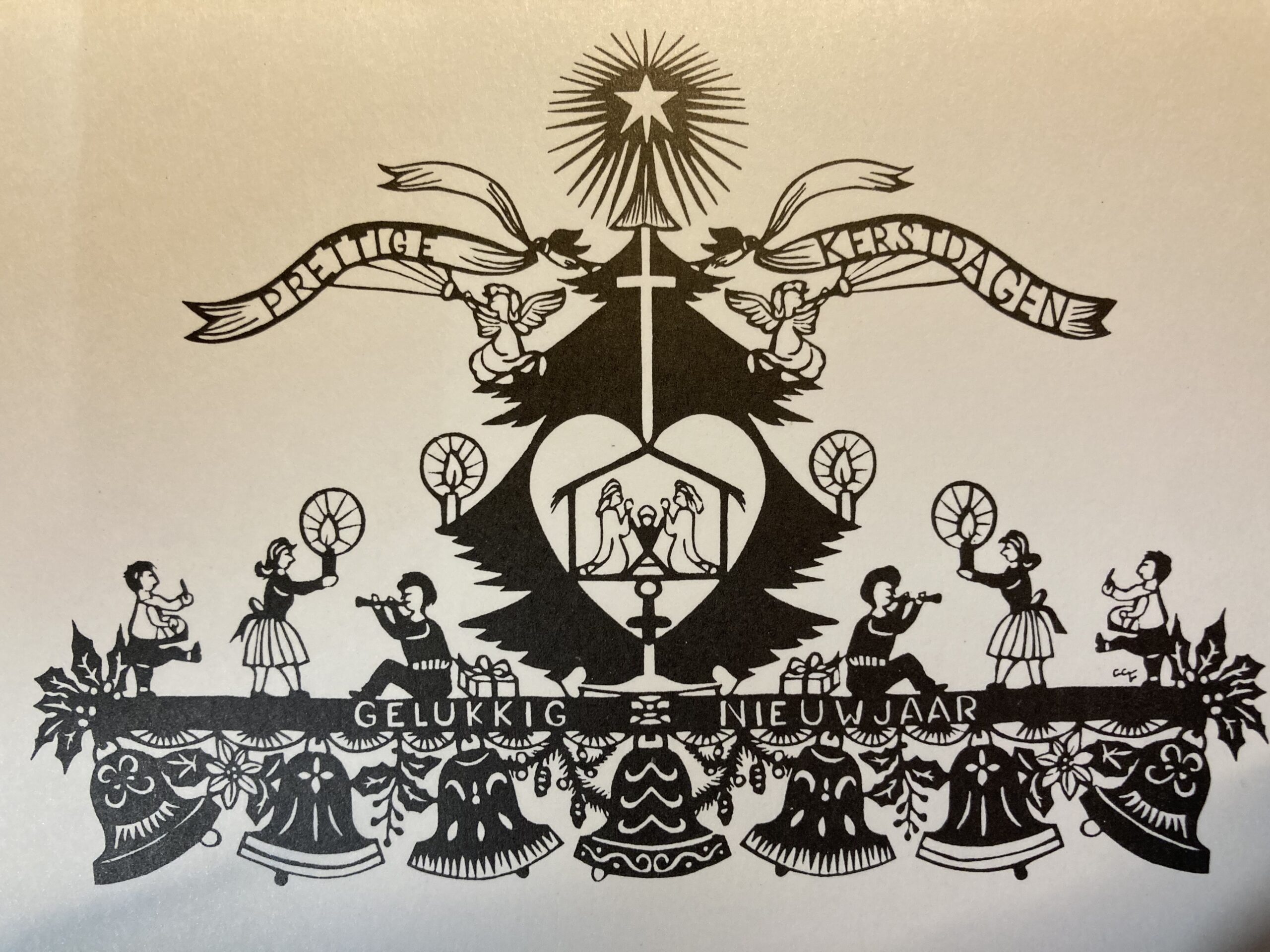 Een gedrukte dubbele kerstkaart met de kerststal in een hart, geprojecteerd op een kerstboom met een banderol met de tekst ‘prettige kerstdagen’, omringd door kinderen en kerstklokken en de tekst ‘gelukkig nieuwjaar’ naar een knipsel geknipt door Carien Carton.